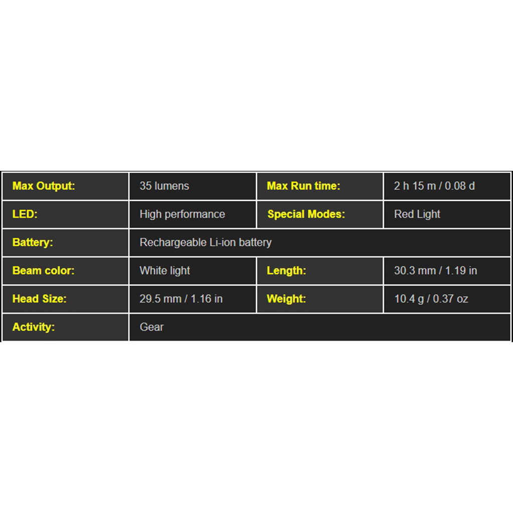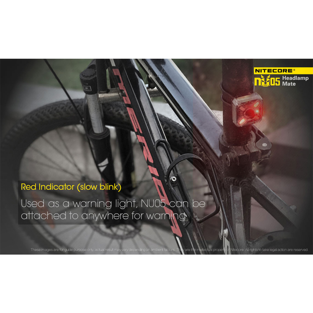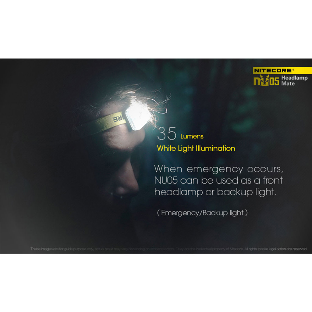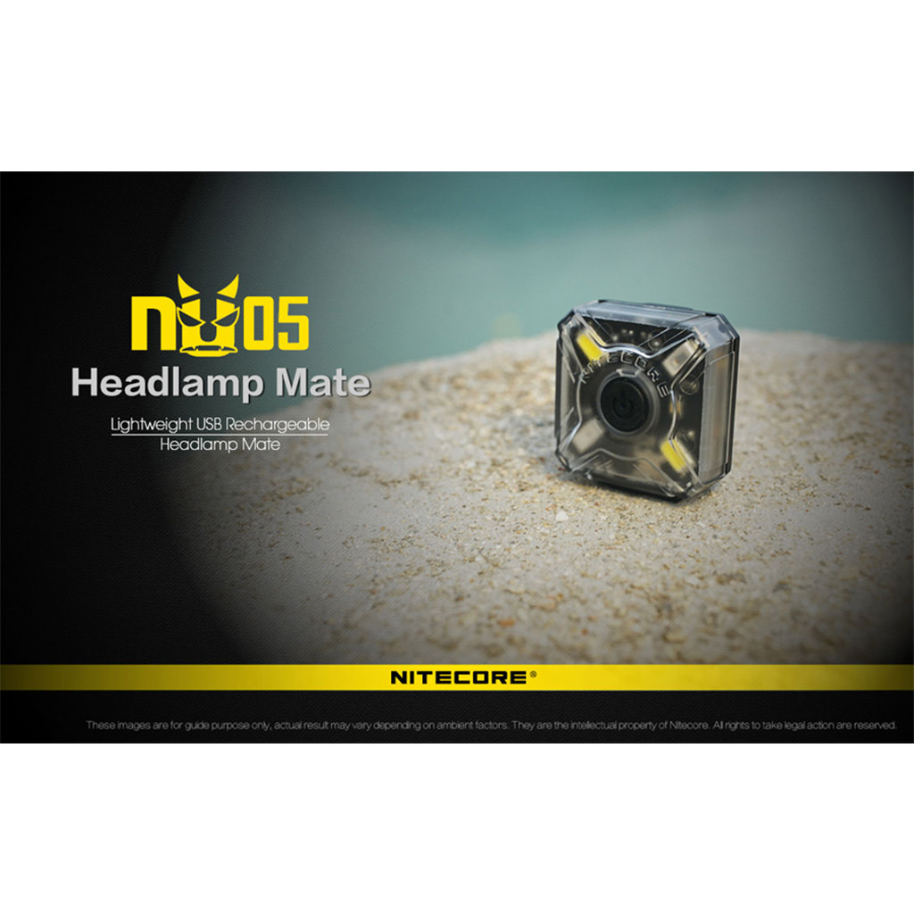 Επαναφορτιζόμενος φακός κεφαλής (Συμπληρωματικός / Βοηθητικός / Δευτερεύων). Είναι ένας πολυχρηστικός, φορητός και επαναφορτιζόμενος προειδοποιητικός φακός που βελτιώνει την ασφάλεια στις νυχτερινές δραστηριότητες μέσα από τις τέσσερις επιλεγόμενες λειτουργίες του. Προσαρμόζεται με τον ελαστικό του ιμάντα είτε στο κεφάλι, είτε στο κράνος είτε αλλού ώστε να λειτουργεί ως προειδοποιητικός κόκκινος φωτισμός για τα αυτοκίνητα,τα ποδήλατα ή τους ανθρώπους στο πίσω μέρος του χρήστη με σκοπό τη ασφάλεια το βράδυ. Είναι πολύ ευέλικτος ώστε να τοποθετείται σε διάφορα σημεία και να εξυπηρετεί διάφορες καταστάσεις (Στην τσάντα πλάτης, Στη τσέπη, Στο γείσο καπέλου, Στο κράνος, Στο πίσω μέρος ενός φακού κεφαλής, Στον καρπό, Κάτω από την σέλα του ποδηλάτου κ.α.). Διαθέτει τέσσερα υψηλής απόδοσης LED που προσφέρουν τέσσερις ειδικές λειτουργίες (Κόκκινος καταδείκτης, Κόκκινος φωτισμός με αργό αναβόσβημα, Κόκκινος φωτισμός με γρήγορο αναβόσβημα, Λευκός φωτισμός με αργό αναβόσβημα). Ο κόκκινος φωτισμός με αργό αναβόσβημα λειτουργεί ως προειδοποιητικό φως και μπορεί να τοποθετηθεί οπουδήποτε ως φωτισμός προειδοποίησης. Επίσης ο κόκκινος φωτισμός με αργό αναβόσβημα είναι ιδανικός για νυχτερινές αθλητικές δραστηριότητες χαμηλών ταχυτήτων, όπως προπομπός ομάδας νυχτερινής πεζοπορίας (λειτουργεί ως οδηγός απόστασης). Ο κόκκινος φωτισμός γρήγορου αναβοσβήματος είναι ιδανικός για μοναχική νυχτερινή αθλητική δραστηριότητα γρήγορης ταχύτητας, όπως νυχτερινό τρέξιμο ή νυχτερινή ποδηλασία με σκοπό την προειδοποίηση των αυτοκινήτων ή πεζών στο πίσω μέρος του αθλητή (Εξυπηρετεί ως σημάδι εντοπισμού μεγάλων αποστάσεων). Ο λευκός φωτισμός με αργό αναβόσβημα χρησιμεύει ως σημάδι εντοπισμού μικρών αποστάσεων και ατομικές δραστηριότητες. Σε ειδικές περιπτώσεις ανάγκης ο NU05 μπορεί να χρησιμοποιηθεί και ως εμπρόσθιος φακός κεφαλής λευκού σταθερού φωτισμού ή ως εφεδρικός του κύριου φακού κεφαλής προσφέροντας λευκό φωτισμό 35 Lumens. Ελαφρύς σαν πούπουλο ζυγίζει μόνο 10,4 γραμμάρια (χωρίς τον ιμάντα) και μικρός με διαστάσεις 29,5mm x 30,3mm x 16,3mm ! Η λειτουργία του επιτυγχάνεται με την χρήση ενός κεντρικού διακόπτη. Μέσα σε διάστημα 3 δευτερολέπτων από την ενεργοποίηση του φακού, πατώντας τον διακόπτη συνεχόμενα κινήστε κυκλικά στις 5 επιλογές φωτισμού. Συνοδεύεται από αξεσουάρ που τον κάνουν ευέλικτο στην τοποθέτηση του σε διάφορα σημεία (Ελαστικός Ιμάντας Κεφαλής/Καρπού, Βάση στήριξης σε σωλήνα ποδηλάτου, Καλώδιο USB για την φόρτιση). Ο ίδιος ο φακός από μόνος του μπορεί να τοποθετηθεί σε οποιονδήποτε ιμάντα κεφαλής άλλου φακού. Η ενσωματωμένη επαναφορτιζόμενη μπαταρία Ιόντων Λιθίου (Li-ion) φορτίζει εύκολα από οποιαδήποτε πηγή ρεύματος USB και διαρκεί έως 20 ώρες λειτουργίας. Είναι κατασκευασμένος από ανθεκτικό πολυκαρβονικό υλικό ανθεκτικο στην τριβή. Μικρή ενσωματωμένη κόκκινη ενδεικτική λυχνία καταδεικνύει την ενέργεια που έχει απομείνει στην μπαταρία. Ανθεκτικός σύμφωνα με το πρότυπο IP66 και σε πτώσεις έως και από 1,5 μέτρα ύψος.