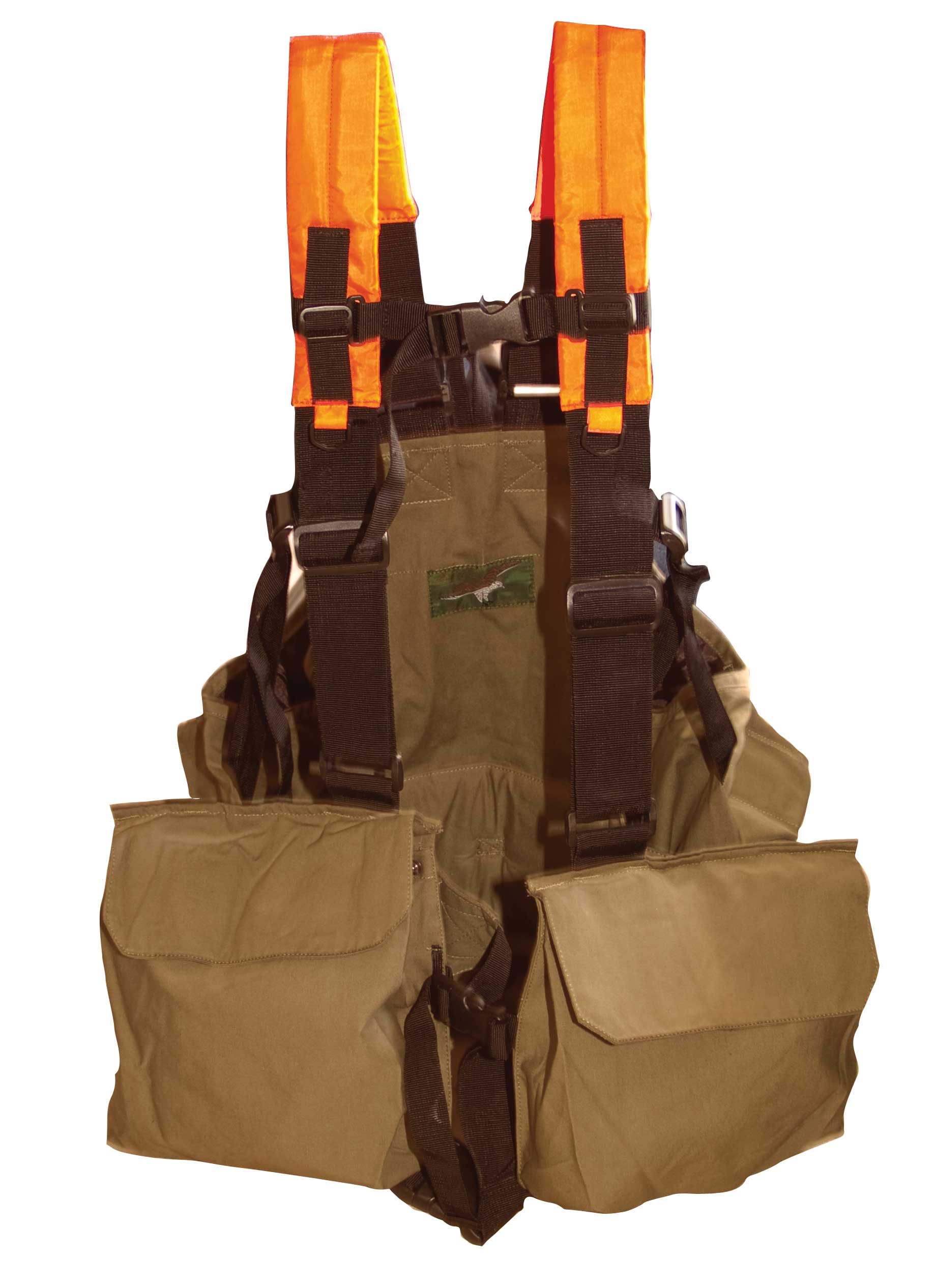 Γιλέκο με πορτοκαλί ρυθμιζόμενους ιμάντες για τέλεια εφαρμογή, μεγάλες εσωτερικές τσέπες με φυσιγγιοθήκες, εσωτερικά διαθέτει δύο μεγάλα σακίδια θηραμάτων και δύο παγουροθήκες.